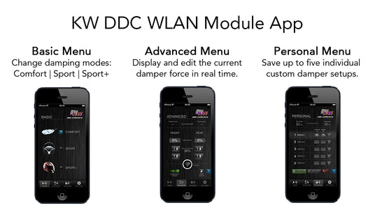 No electronically controlled standard suspension available? Then retrofit the adaptive KW DDC ECU! The scope of delivery includes the electronically adjustable KW coilover suspension, high-performance control unit with vehicle-specific cable set and DDC button for control from the cockpit. Optionally, the different driving modes can be selected via app.