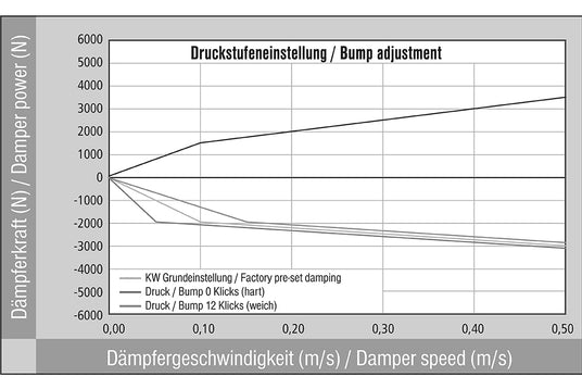 With 6 precise clicks in low-speed and 14 precise clicks in high-speed range of the compression stage damping, the cross sections in the valves are decreased or increased, in order to achieve either more or less compression stage damping. The “TVCLH-A”-technology has a blow-off characteristics with large cross-sections which allows high low-speed forces for an optimum bracing of the vehicle body without raising the body in the case of wheel-induced high damper speeds (driving over curbs). The separate low and high-speed setting is always supplied with an additional rebound setting (“TVR-A”-technology) for an in dependent 3-way damper setting.